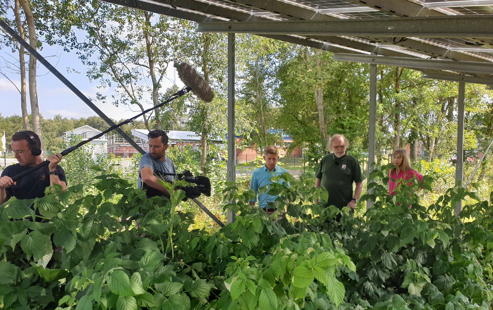 Fernseh-Dreh für die Sendung "BINGO - die Umweltlotterie" unter der Agri-Solar-Modellanlage der Firma SUNfarming aus Erkner bei Berlin auf dem GreenTEC Campus in Enge-Sande (Nordfriesland), hier mit gut wachsenden Himbeerpflanzen. V. l. NDR-Drehteam, Stephan Franke (Projektentwickler bei SUNfarming), Hans-Jörg Lüth und Dr. Ina Walenda (NaturFreunde S-H)
